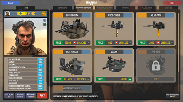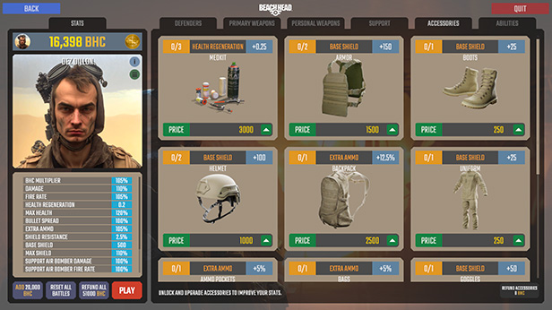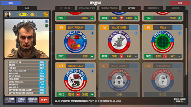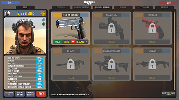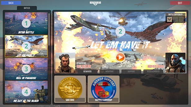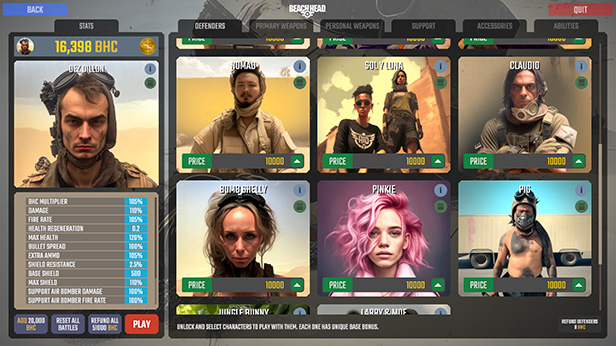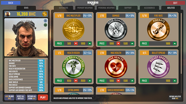 Welcome to "BeachHead Battles," a thrilling new way to experience BeachHead. BeachHead Battles takes the progressive gameplay you loved from the original while progressively building the entire BH World. As a DEFENDER, you're not just a player; you're a guardian of freedom and the cherished way of life in this world, defending its citizens against the malevolent Musso Khan and his death army. Select your unique character/defender, harness their abilities, and unlock the weaponry and accessories essential for victory. With each kill and triumphant battle, you earn valuable BHC (BH credits), providing you with the means to shape your destiny in the vibrant BH marketplace. Expect the unexpected in every battle, except one thing - rewards and an array of cool, indispensable items await you. Dive into BeachHead Battles and become the hero this world needs!