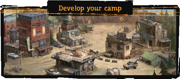 Develop your survivor camp to unlock buffs. Upgrade merc skills in the Training Hall, recruit new mercs at the Mercenary Base, and upgrade your weapons and armor in the workshop. Upgraded buildings increase your chances of survival.