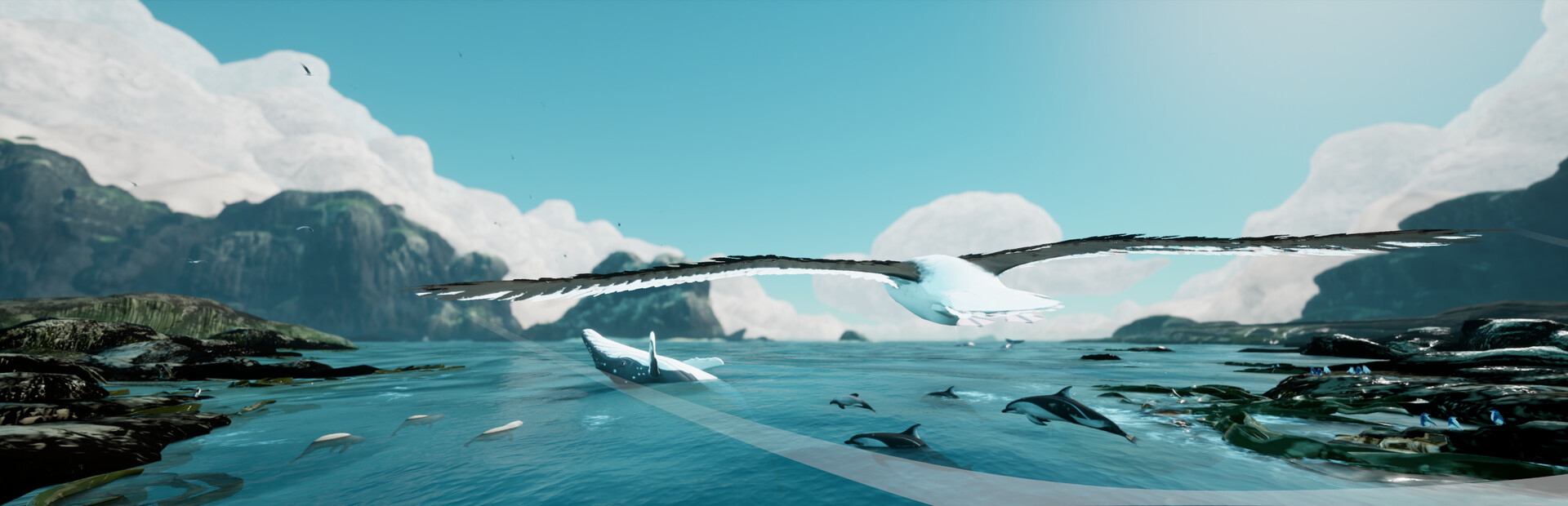 Toroa have the largest wingspan in the world! Glide on wind currents and explore stylised landscapes, from calm seas to verdant islands and into dream-like cloudscapes.