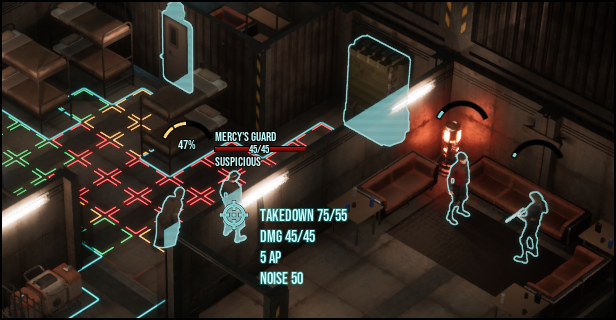 Each step and action (lockpicking, climbing, using computers, killing guards in stealth mode, etc) generates noise. Not a whole lot of noise to instantly alert the guards the moment you do something, but enough to add up over time and raise the guards' suspicions. The higher the guards' Perception, the faster the alert bar is filled. An alerted guard turns towards the last noise generated, meaning a lot of safe tiles will turn red and if you're in the line of vision you'll be instantly discovered.