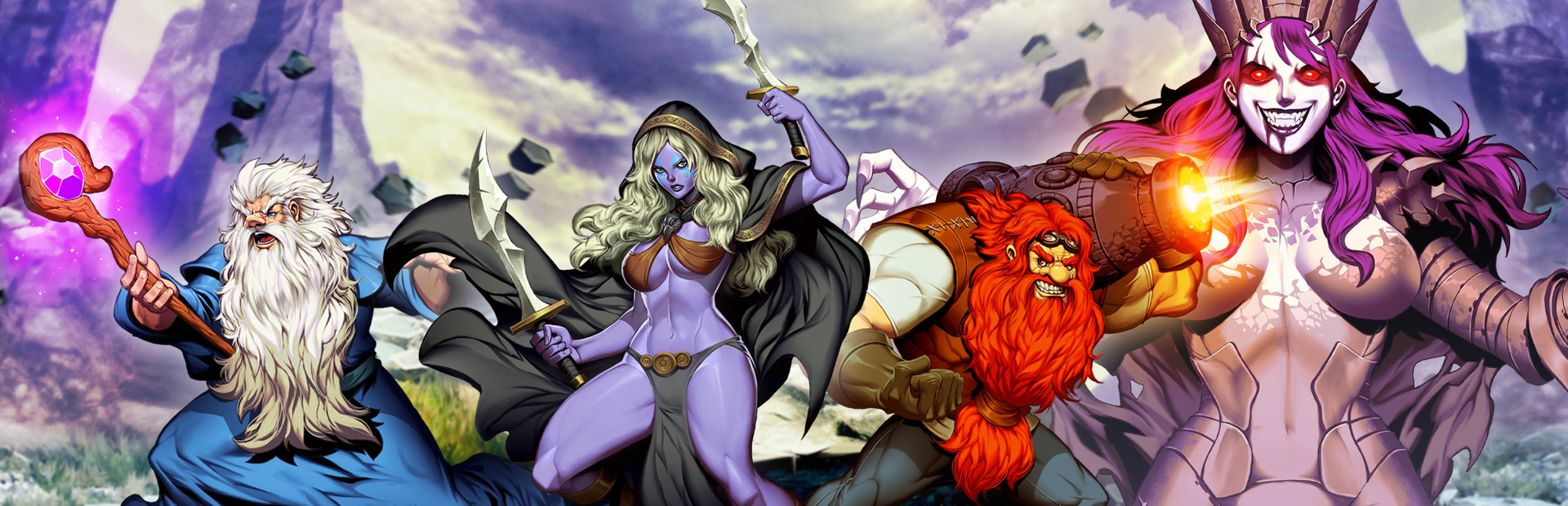 Fae wields two deadly blades and swift throwing daggers; Iolo whips his enemies with his mighty beard and can conjure searing fireballs; Rooney carries a lethal cannon which he uses to bludgeon his enemies or launch cannonballs from a distance.