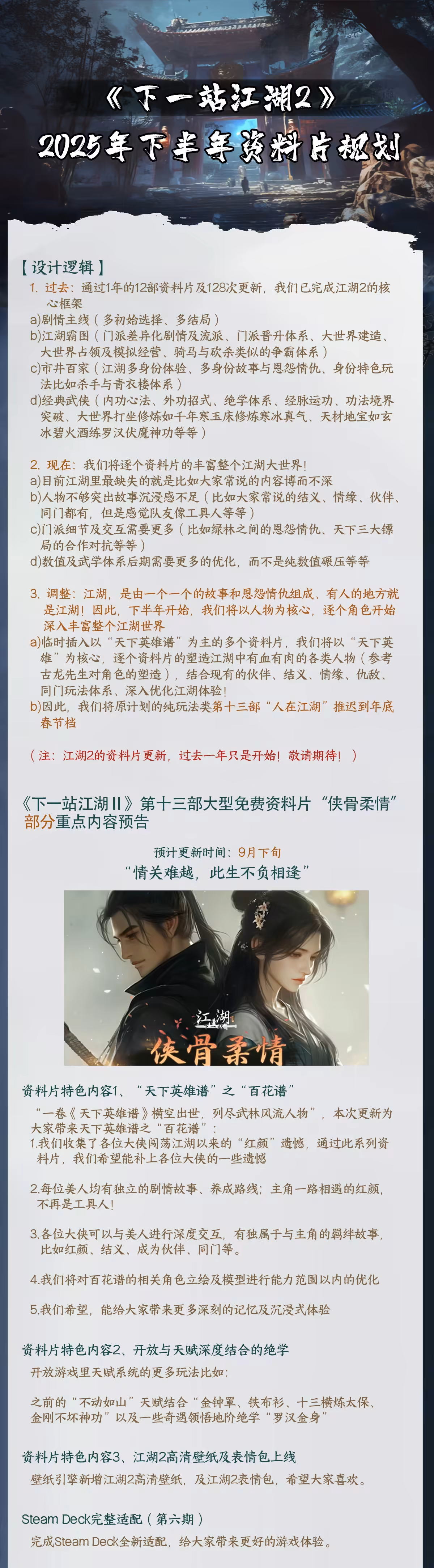 庞大内容、及时更新:上线迄今已超过百更、八部大型玩法资料片!2025年我们将继续砥砺前行,用更多更好玩的内容来填充这个江湖大世界!